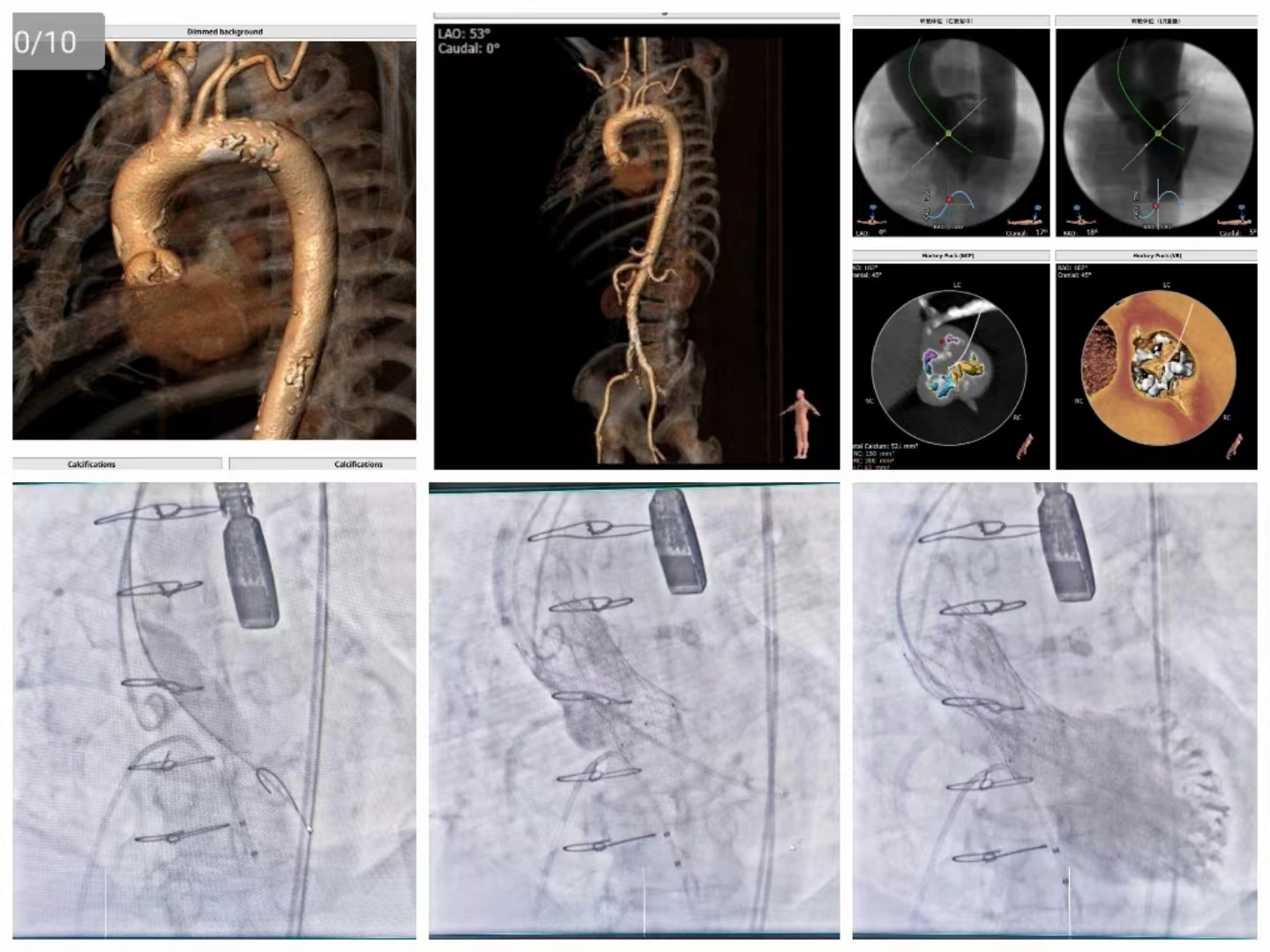 某患者男性,24年前行甘肃省第一例冠脉搭桥术,14年前行冠脉支架术,现主动脉瓣重度狭窄,瓣膜严重钙化,髂动脉迂曲钙化,患者反复晕厥,呼吸困难。患者入院后,经过多学科集体讨论,与患者及家属充分沟通各种手术方式的风险和获益,患者及家属选择经皮主动脉瓣置换术( TAVR )。最终在snare协助下瓣膜成功跨瓣且成功释放,跨瓣压差消失,无返流,患者平安返回病房。