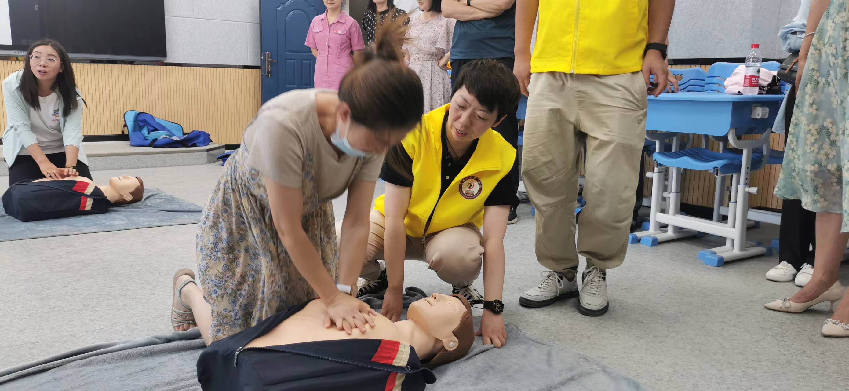 随后,青年志愿者牟青、王泓等人为全校老师开展心肺复苏、海姆立克急救知识和技能培训,提高老师的自救互救能力。