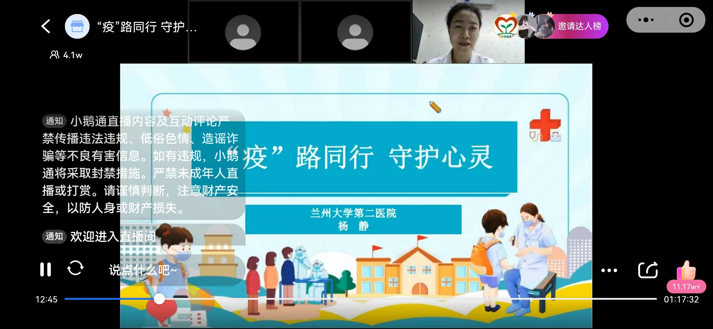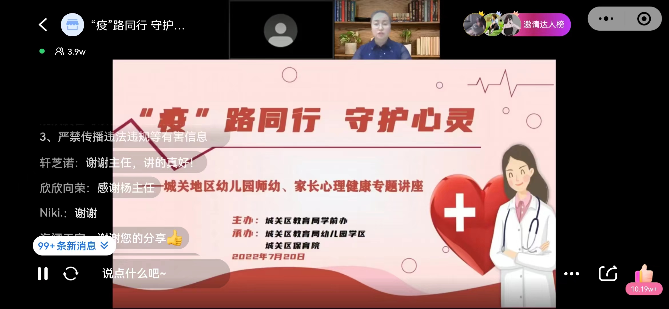 在当前兰州市城关区疫情防控的关键期,为有效应对新冠疫情带来的师幼、家长及重点人群心理恐慌,缓解由此引发的不良情绪。7月20日,兰大二院儿童发育行为科主任杨静教授受邀通过网络平台为城关区全区公办民办幼儿园家长、教师做了一场题为《“疫”路同行 守护心灵》--疫情居家期间心理健康专题讲座,讲座由城关区教育局学前办牵头主办,城关区保育院承办,城关区保育院易大分院执行院长岳亚萍主持讲座。