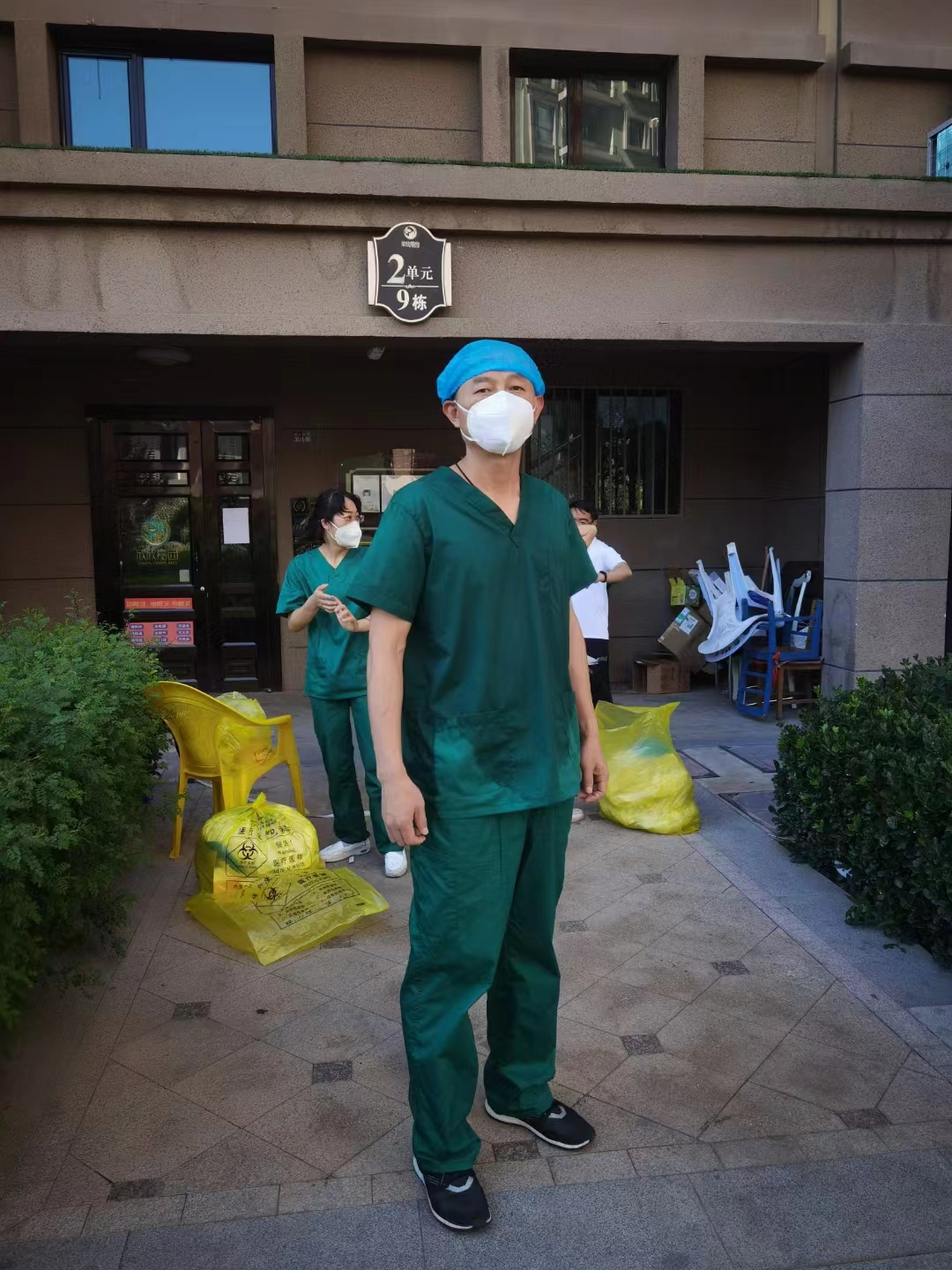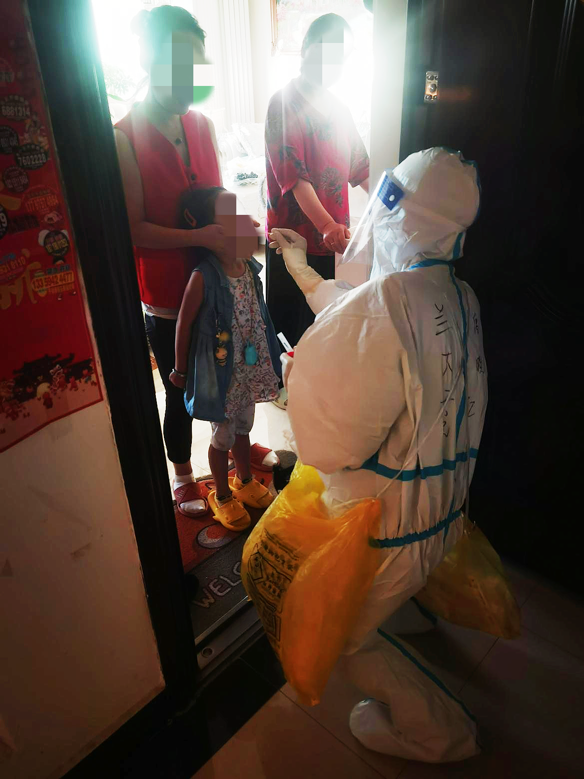 疫情就是命令,防控就是责任。七月的兰州,正值酷暑,连日的高温,给身着密不透风的防护服、防护面屏和防护口罩的队员们带来了极大挑战,队员们深入重点区域进行核酸采样。在这些重点区域内,有很多老旧小区,为了确保不漏一户、不落一人,队员们只能一户户、一层层、一栋栋“爬楼”挨家挨户的进行核酸检测。由于任务紧,队员们不得不加快脚步,队员们防护服里“装满”了汗水。我的搭档王建国老师每次脱下防护服后,里面的衣服已全都湿透。白衣担使命,实干践初心,队员们在组长的带领下,秉持“严、细、实”的工作原则,逐户逐人进行“地毯式”核酸检测。