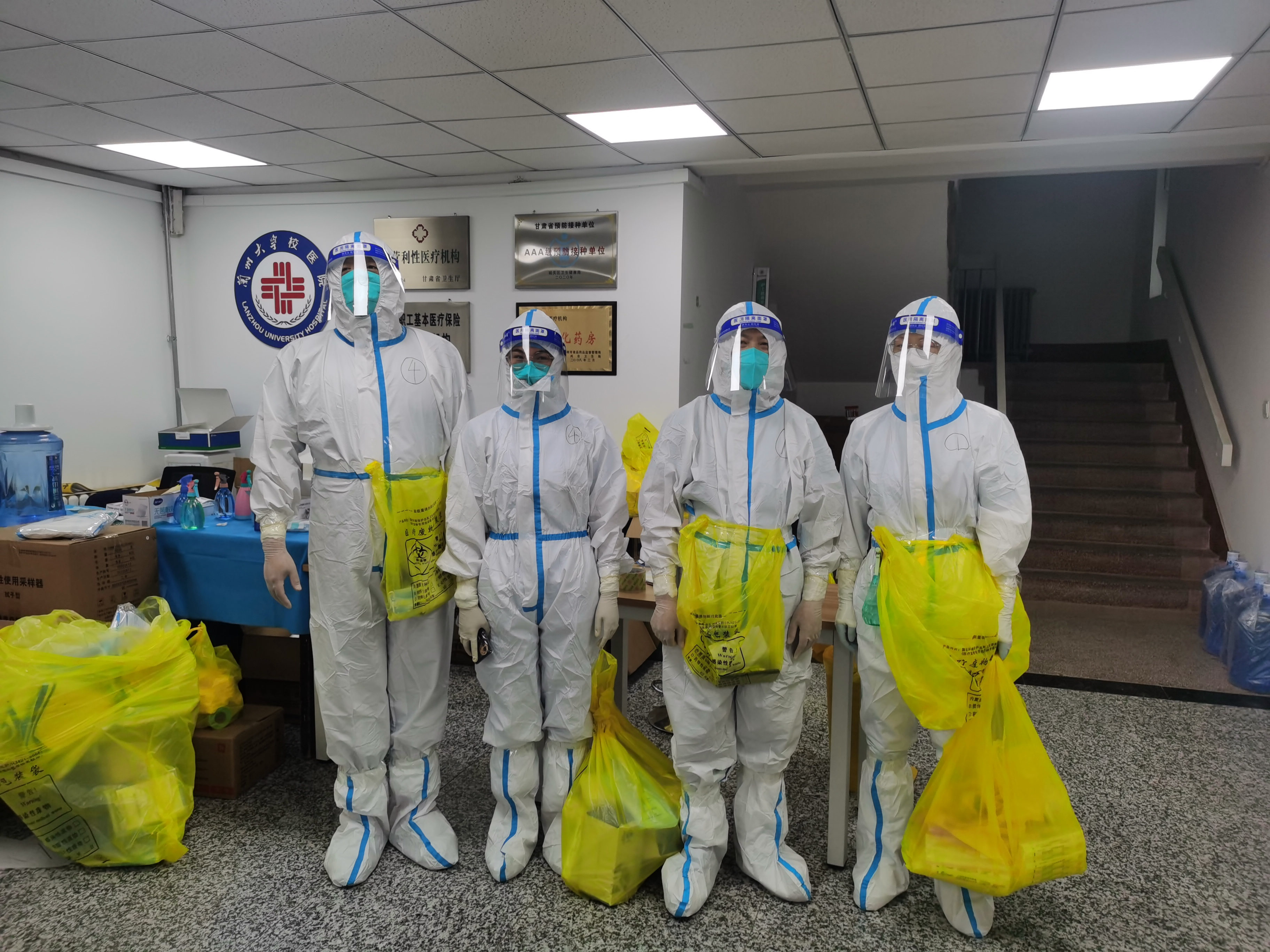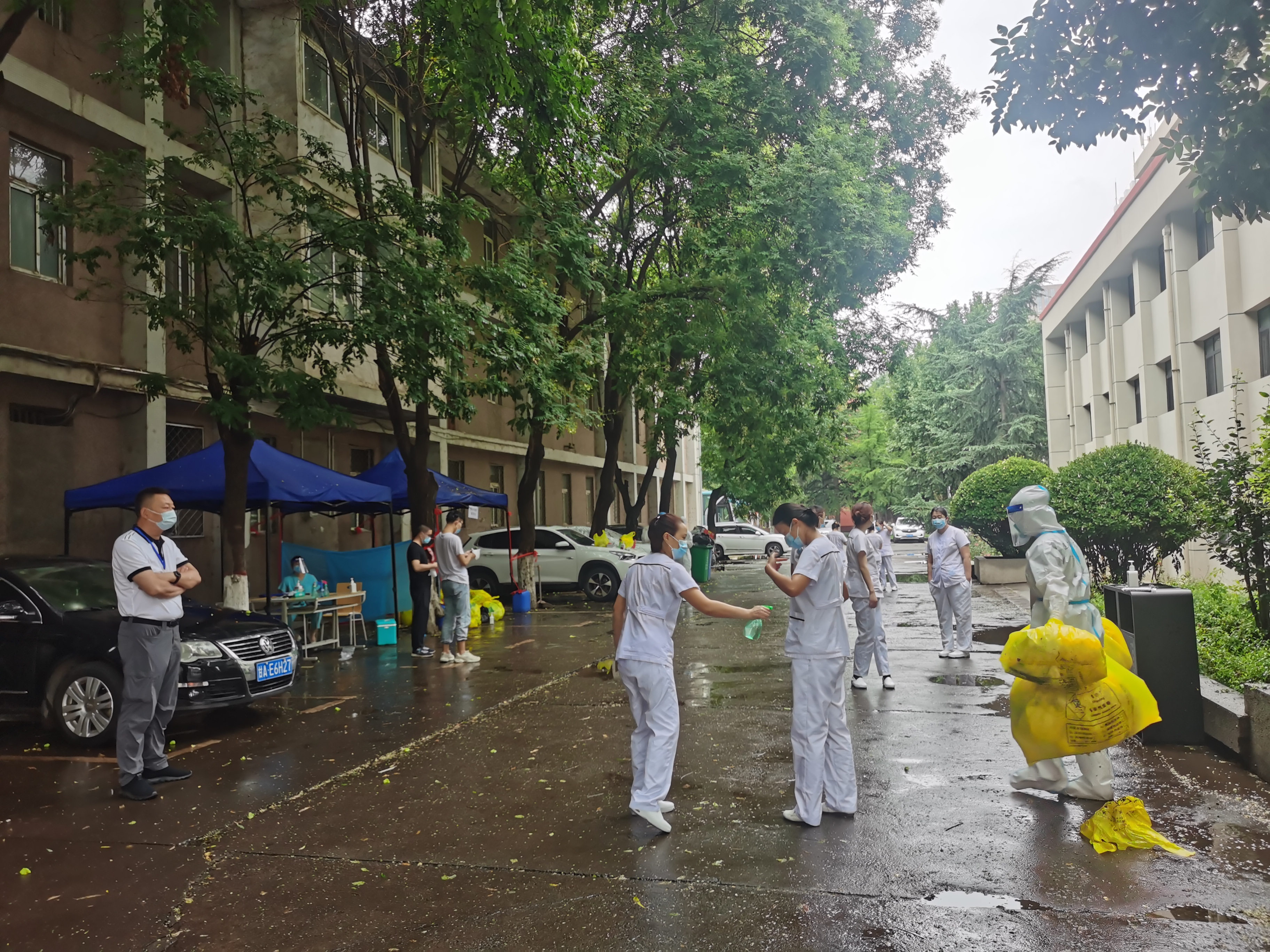 自7月11日上午8时起,校医院值守人员和兰大二院校医院榆中校区医疗队分别前往城关校区和榆中校区,或在医院应急值守,或接听医疗服务热线,或信息统计,或核酸检测,或物资配送,或准备第二天的核酸检测和各楼宇防护所需物资,所有人员齐心协力构筑起校园疫情防护墙。