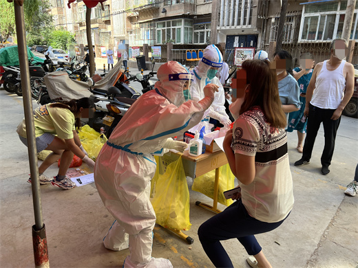 最初几天疫情形势严峻,核酸采集任务繁重,每天工作到凌晨一两点,说不疲惫那是假的,穿上防护服,戴上N95口罩、隔离面罩。“白衣护甲”能阻断病毒,但是在这异常高温酷暑的天气中,密不透风防护衣内瞬间温度骤升,如同蒸笼。必须减少喝水,一面扫描身份证,认真核对每一个信息,一面重复着简单而细心的操作,贴管码、整理采集器,一切的操作只为更加准确、快速、便捷。其中单日最高核酸采集量达到33000 人,每组都在500人以上,标本及信息处理无一出现纰漏。带队梁玉红老师每天都是寝食难安,因为多方工作需要她全面协调,每天要精神需高度集中,除了反复叮嘱指导团队成员严格按照规范做好防护,检查健康码,为队员做核酸,全面关注所有队员的精神状态、关心大家的饮食住行等等,防护服、口罩、手套、面屏、试管贴码等,每一种物资品种都要仔细点数打包,全力以赴为疫情防控提供强有力的后勤保障。