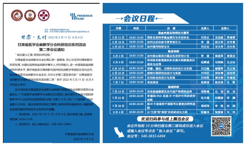 “南北星火汇聚,照亮科研征程。”兰大二院麻醉科作为甘肃省医学会麻醉学分主委单位,长期以来一直聚焦、关心与支持甘肃麻醉学科研发展。为强化培养甘肃省麻醉学青年人才科研能力,进一步提高甘肃省麻醉学科科研水平,更好地促进甘肃麻醉与国内知名麻醉学专家的交流与合作,由甘肃省医学会麻醉学分会主办、兰大二院承办的“甘肃省医学会麻醉学分会科研培训系列活动(第二季)”顺利于线上举办。