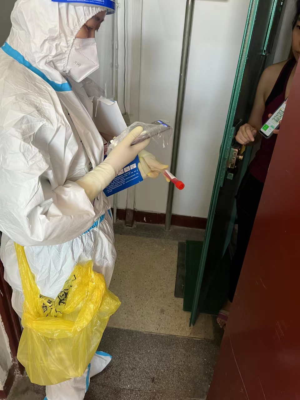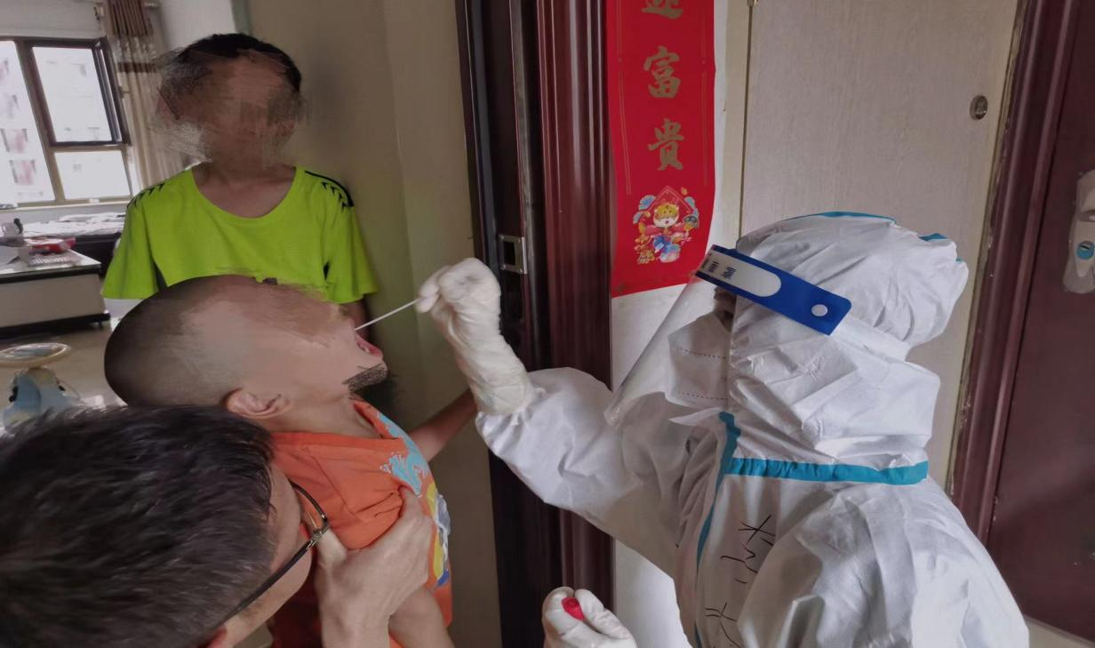 “手机扫码、核对信息、手消毒、打开盖子、采集核酸样本、装进试管、拧紧盖子、手消毒……”看似简单的动作一天要重复几百上千次,每天不吃不喝坚持工作5、6个小时,每次爬完楼都是汗流浃背甚至呼吸困难,需要稍作休息才能继续工作。