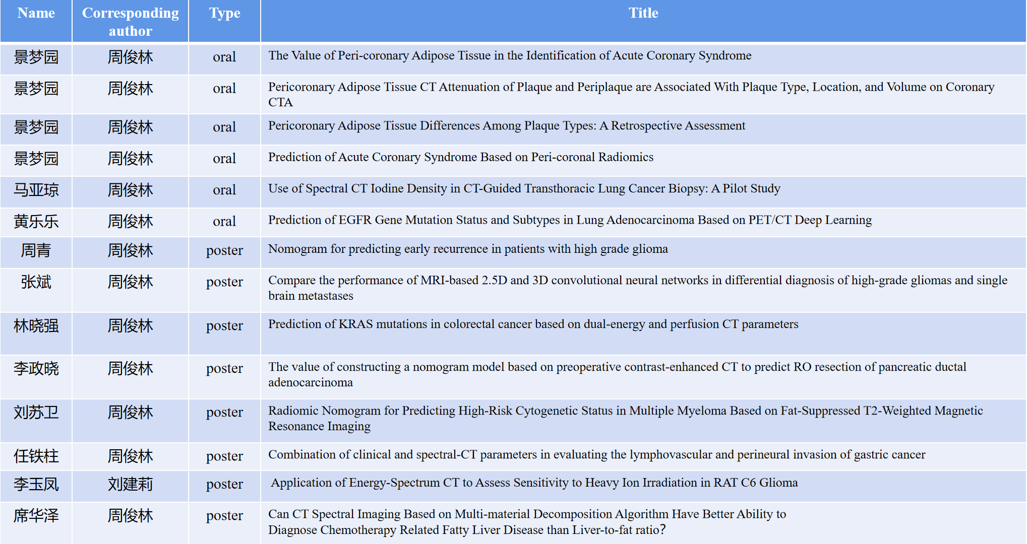 论文研究内容主要涉及能谱CT技术、CT灌注技术、分子影像技术及人工智能在心血管疾病、消化系统疾病及各类肿瘤中的临床应用及实验研究。由周俊林教授、刘建莉副教授指导,以提高临床诊断水平为基础,以解决临床重要问题为导向,团队探索研究了冠状动脉不同类型斑块及周围脂肪组织在急性冠脉综合征诊断与鉴别诊断中的价值;能谱及灌注定量参数在CT引导下经胸肺癌活检、胃癌淋巴血管和神经周围浸润、化疗相关脂肪肝诊断、结直肠癌KRAS突变以及大鼠C6胶质瘤对重离子照射的敏感性中的应用价值。