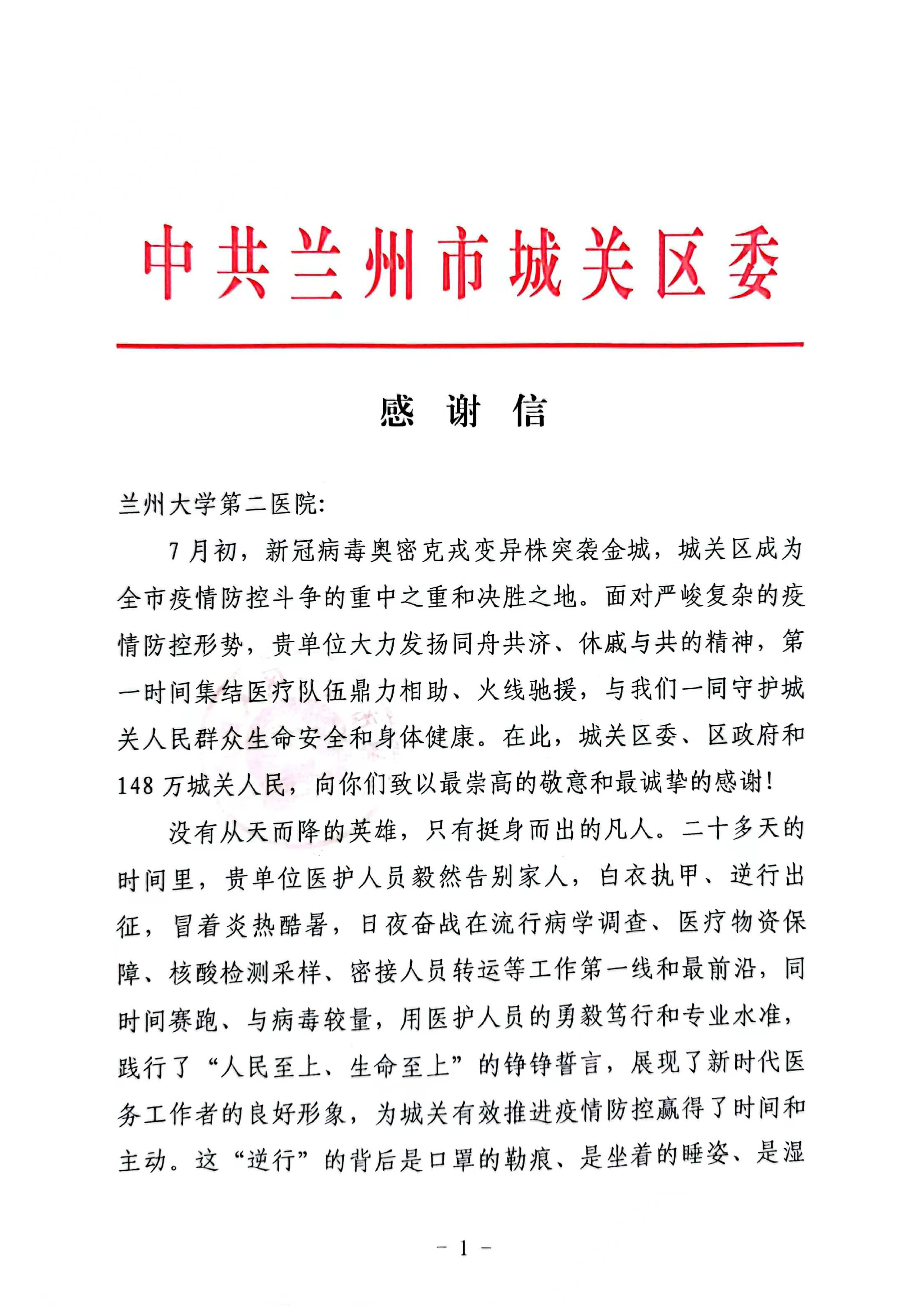 近日,兰大二院收到中共兰州市城关区委、兰州市城关区人民政府的感谢信。