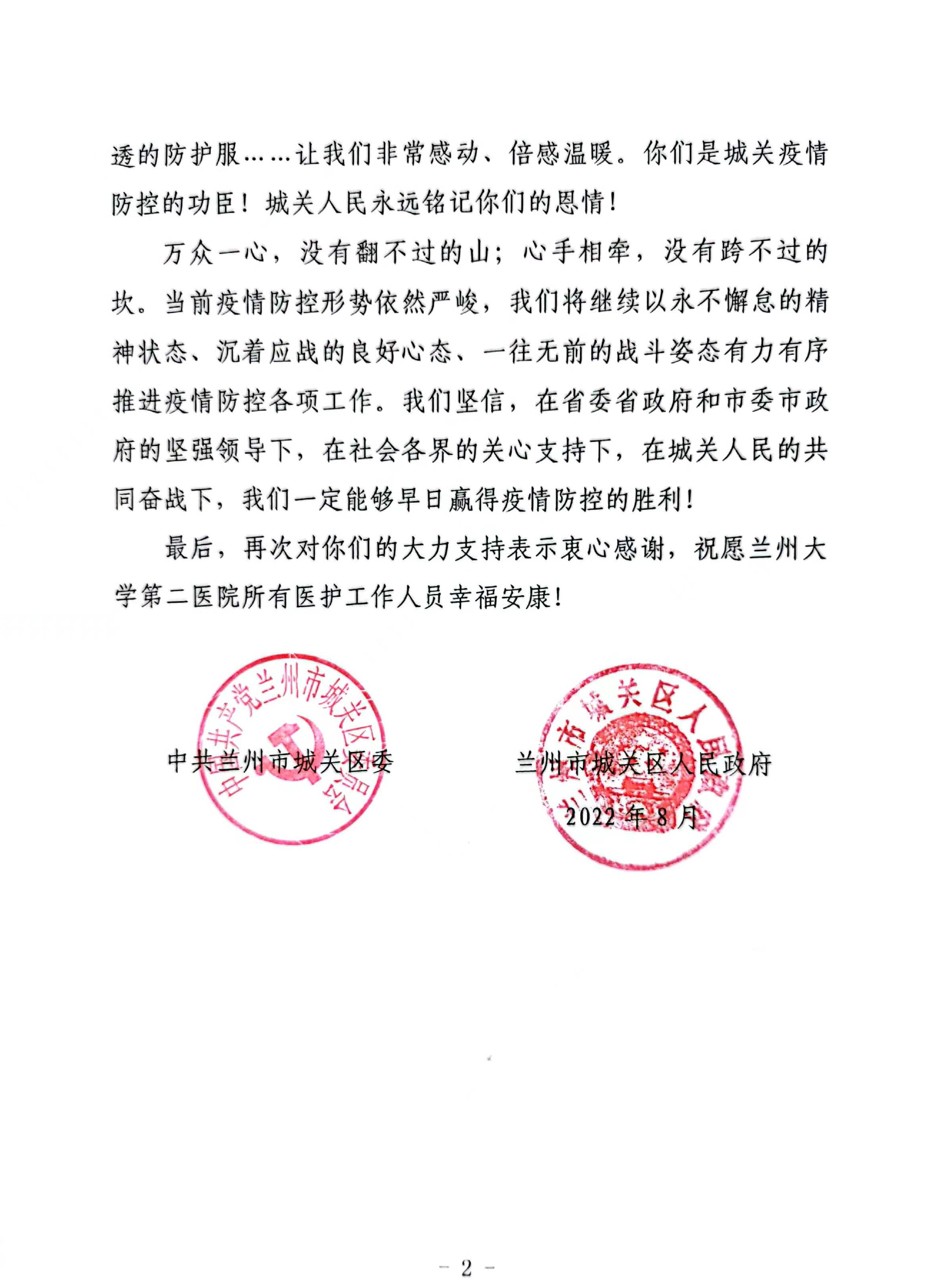中共兰州市城关区委 兰州市城关区人民政府向兰大二院致感谢信