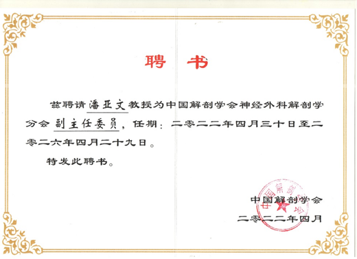 近日,兰大二院潘亚文教授当选中国解剖学会神经外科解剖学分会副主任委员。