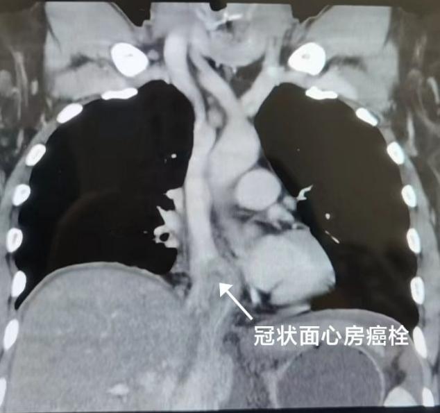 患者一月前主因“右侧腹部胀痛不适20余天”就诊于当地医院行相关检查后诊断为右肾肿瘤合并腔静脉及右心房瘤栓,患者同时合并肝脏肿大、胆囊结石及门脉高压等。肾癌合并腔静脉IV级瘤栓临床少见,腔静脉及右心房瘤栓随时可能脱落致肺动脉栓塞危及生命需要尽快切除,但手术风险极高。科室积极完善术前相关实验室及影像学辅助检查,术前心脏彩超及腹部大血管彩超检查提示:右肾静脉及下腔静脉脐水平以上70mm至右心房栓子形成。胸腹部MR及CT检查提示:右肾恶性肿瘤(10×9×7cm),R.E.N.A.L评分3+1+3+X+3=10X;右肾静脉、下腔静脉、右心房瘤栓形成;胆囊结石,腹水。