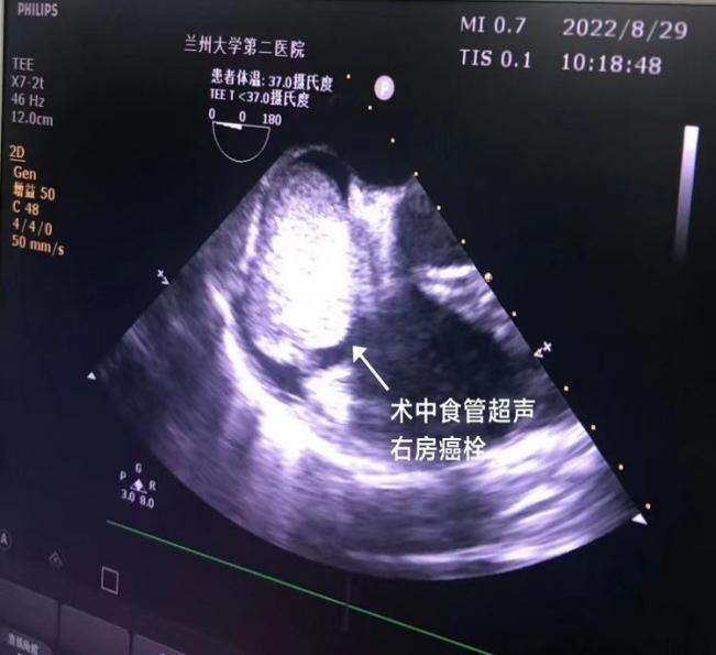 鉴于患者病情罕见复杂、手术难度大、风险高,兰大二院充分发挥多学科讨论(MDT)优势,积极组织包括麻醉科、心胸外科、血管外科、普外科、心内科、超声科、影像科等相关科室进行术前多学科讨论,群策群力,对手术方案和手术分险进行了讨论和总结。最终在经过详细周密的术前准备后,泌尿外科二病区与普外科、心外科及麻醉科通力合作,密切配合对患者实施了右肾根治性切除术+肝脏翻转术+胆囊切除术+体外循环下右心房切开取栓术+腔静脉瘤栓切除并腔静脉血管成形术,在术中食道超声的动态监测下成功切除右肾肿瘤并完整切除瘤栓,手术时长约8小时,瘤栓长约30cm, 手术顺利, 术后经过一周的精心护理后,患者痊愈康复出院。