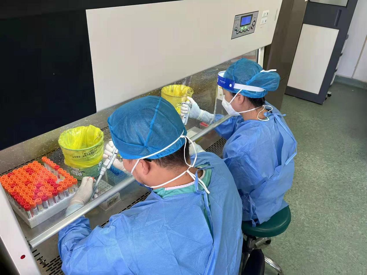 疫情来袭,核酸先行。每次疫情发生,核酸检测人员是颗“最闪亮的星”,会受到社会和人们的关注,是他们在第一时间为大家做出了是患非患的诀择,中心的核酸检测8人团队也不例外,每天要承担全院职工、患者、陪员及后勤人员上千管核酸检测任务。检验标本量大,责任更大,每个人在进入实验室后都争分夺秒,为满足“ “五早”的要求,大家紧密配合,无缝衔接,一批又一批的提取,一波又一波的扩增分析,虽然汗流浃背口干舌燥,仍能顽强坚持紧张有序工作,顺利地完成了当天当班的检测任务,为全院的新冠核酸筛查贡献了我们检验人的力量。