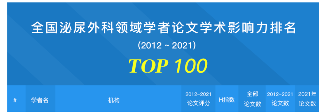 据悉,该排行榜的建立基于论文的学者学术影响力评价方法、指标体系和数学模型,通过计算每位学者2012—2021年的全部论文总积分,按总积分排序得到百强排名。从算法上而言,本榜单数据可以客观反映国内泌尿外科领域专家的学术影响力。