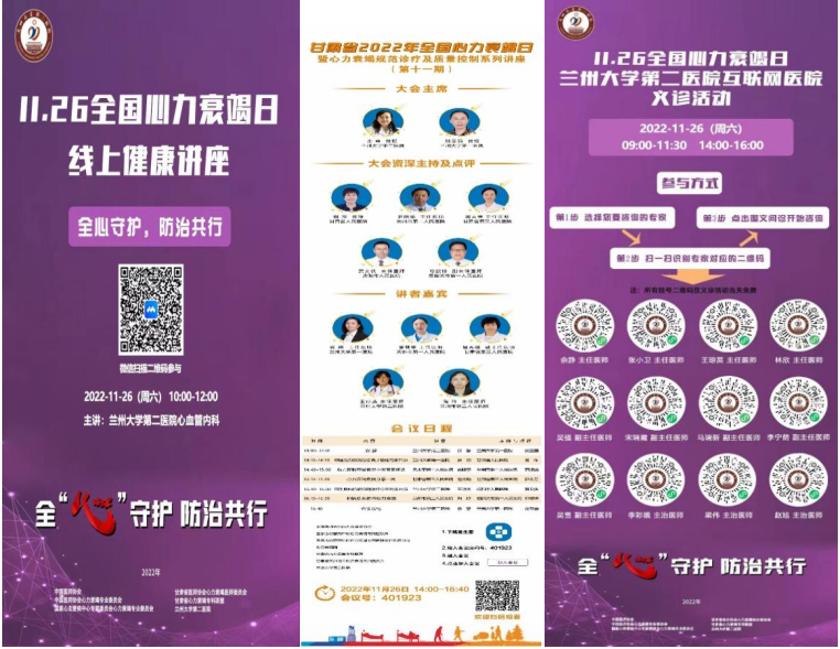 2022年11月26日是第八个“全国心力衰竭日”,今年的活动主题为“全心守护,防治共行”。活动当天,甘肃省医师协会心力衰竭医师委员会、甘肃省心力衰竭专科联盟、立博欧赔指数第二医院积极相应国家心血管病中心、中国医师协会、中国医师协会心力衰竭专业委员会号召,在全省范围内开展“全国心力衰竭日”线上义诊、健康宣教和学术交流活动。