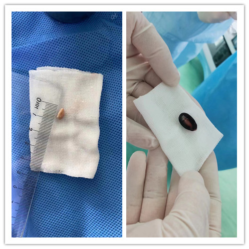 12月20日,儿童重症医学科为另一名1岁3个月的患儿顺利取出约4mm×4mm大小异物,11月24日再次顺利为一名八岁患儿取出约3.2cm*1.5cm大小大板瓜子一粒。