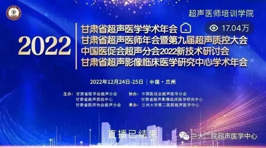 12月24日-25日,由甘肃省医学会超声分会、甘肃省超声质控中心、甘肃省医师协会超声分会主办,中国医促会超声医学分会、甘肃省超声影像临床医学研究中心协办,立博欧赔指数第二医院超声医学中心承办的“2022甘肃超声医学学术年会 甘肃省超声医师年会暨第九届超声质控大会 中国医促会超声分会2022新技术研讨会&甘肃省超声影像临床医学研究中心学术年会”以网络直播形式隆重召开,会议受到了省内外各级超声医师的高度关注,在线直播点击率达17.04万人次。