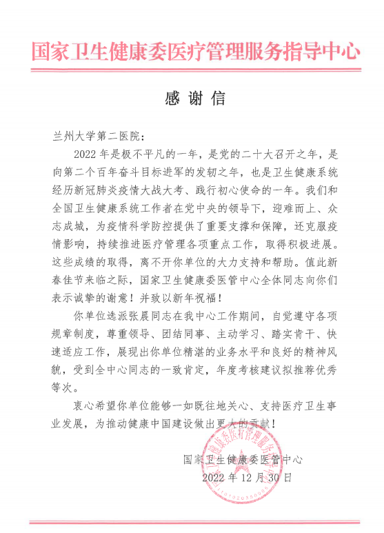 近日,国家卫生健康委医疗管理服务指导中心向医院致感谢信,向医务处张晨同志表示感谢。