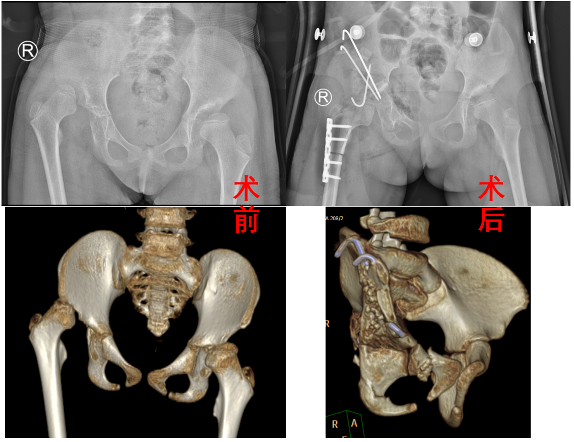 患儿7岁2月,入院前5年初学走路时发现跛行症状,家属未充分重视,跛行步态随生长逐渐加重,直至入院前2月确诊为右侧DDH,经多方求医后就诊于兰大二院。入院后,小儿骨科任小军副主任医师在刘文忠主任指导下,充分评估患儿病情,开展病例讨论、集体讨论,最终确定实施Bernese骨盆三联截骨术,并联合实施股骨近端短缩去旋转截骨内固定术。术后效果良好,术后1周后康复出院。
