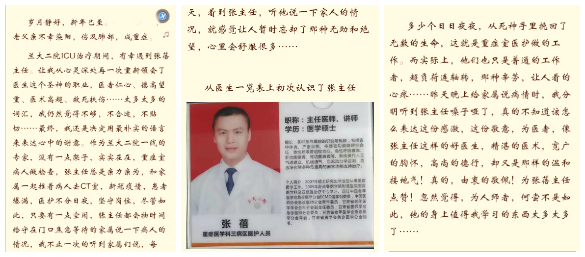 据了解,作者的亲人感染了新型冠状病毒,并逐渐发展为重症患者,在兰大二院就诊期间,重症医学科三病区主任医师张蓓认真负责的态度、过硬的医疗技术及暖心的人文关怀令他十分感动。