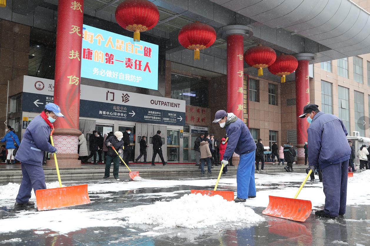 2月12日入夜,兰州市迎来一场大雪,积雪给前来就诊的患者和家属带来了诸多不便。兰大二院提前做好应急准备,后勤保障处、保卫处的工作人员提前到岗及时进行清雪除冰,畅通就诊道路,全力保障患者和家属的就诊安全。