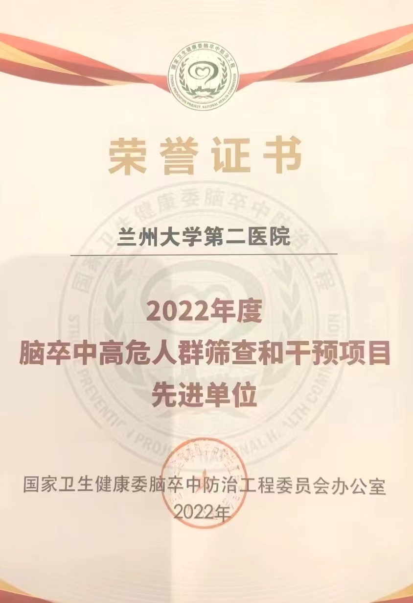 【喜讯】兰大二院喜获2022年度脑卒中高危人群筛查和干预项目先进单位