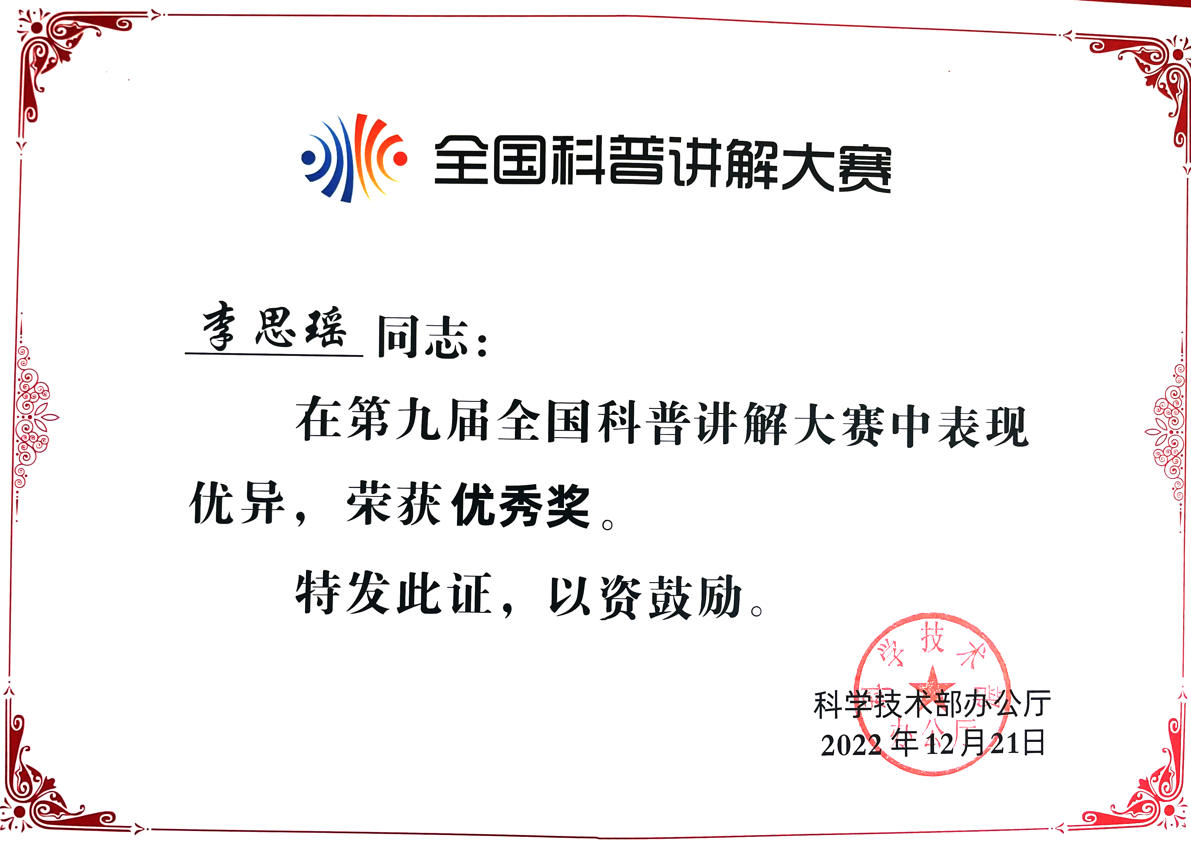 全国科普讲解大赛由科技部、中央宣传部、中国科协等单位共同举办,是为配合全国科技活动周而举行的重大示范活动,是目前全国范围最大,水平最高、代表性最强的科普讲解比赛。2022年5月,甘肃省举办第七届科普讲解大赛,兰大二院李思瑶获得一等奖,并于2022年12月代表甘肃省参加第九届全国科普讲解大赛。