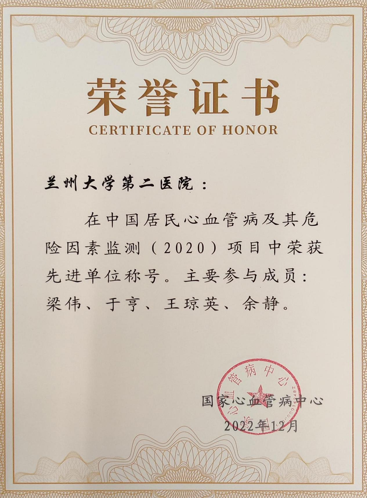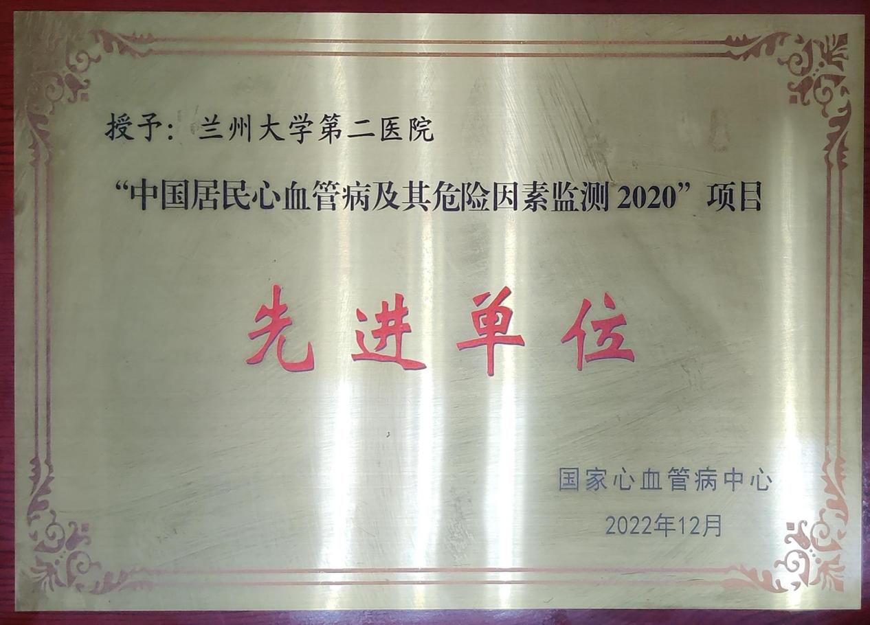 【喜讯】兰大二院荣获“中国居民心血管病及其危险因素监测2020”项目先进单位