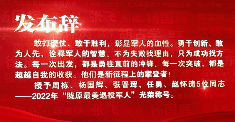 发布仪式上,兰大二院周栋主任等18名同志获得“陇原最美退役军人”个人荣誉称号。“陇原先锋”兰州市兰州蓝护卫者退役军人志愿服务队、“陇原先锋”酒泉市肃州区退役军人红色宣讲志愿服务队获得“陇原最美退役军人”集体荣誉称号。
