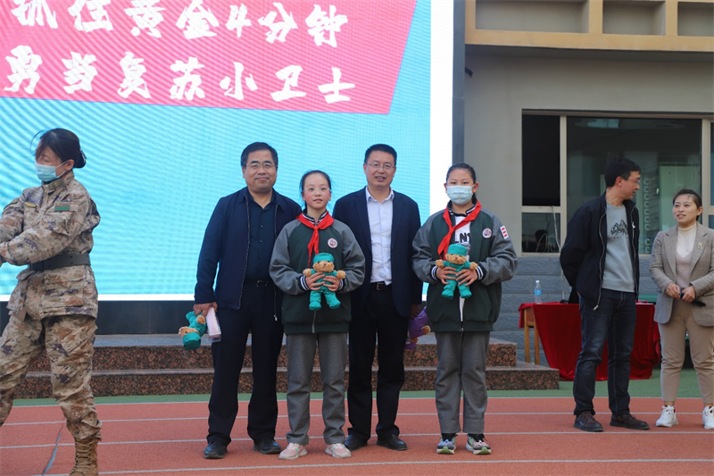 王迎斌主任(左一)和甘雨阳校长(左三)向参加心肺复苏对抗赛的获胜小学生颁发纪念品