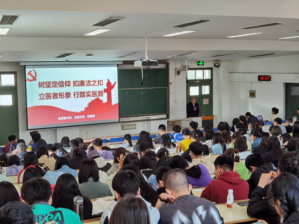 邢耀荣从国家对医疗领域的新要求、医者与医德医风、医务人员应当遵守的纪律规矩、扣好从医的第一粒扣子等方面,教育引导大家在今后的医疗实践活动中,牢固树立以患者为中心的工作理念,全心全意为人民服务,践行医疗机构从业人员行为规范,做到知敬畏、存戒惧、守底线。另外,他强调,本次讲座是学习宣传贯彻习近平新时代中国特色社会主义思想主题教育的一项活动,同时也是为即将进入临床实习的医学生们提前注入“廉洁疫苗”。他要求同学们,一要公私分明,将清正廉洁根植心中;二要抵制诱惑,廉洁从医从防微杜渐做起;三要洁身自爱,从源头上克服各种私心杂念;四要躬身自省,培养自己的廉洁好习惯。希望大家做“身心健康”的未来医务工作者,做有理想、敢担当、能吃苦、肯奋斗的新时代好青年。