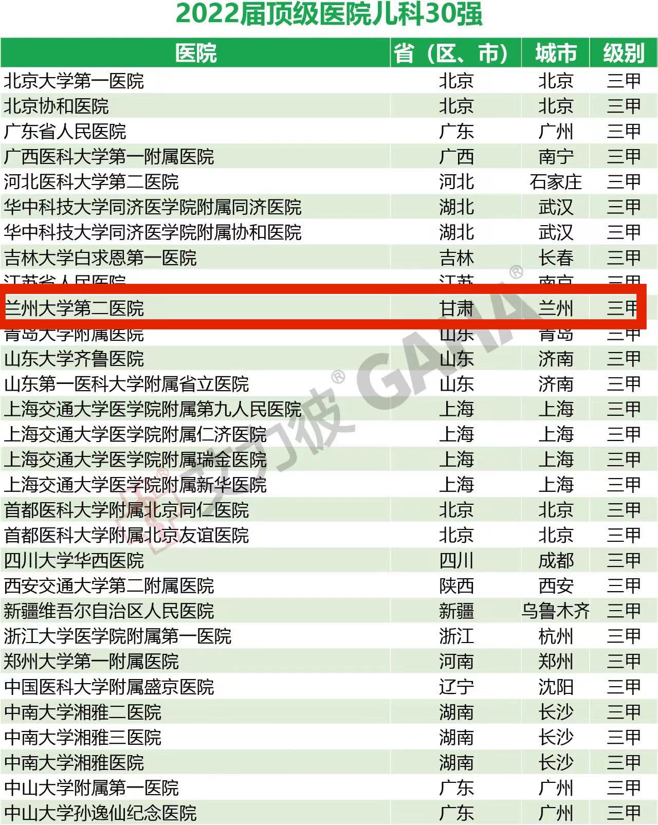 【喜讯】兰大二院儿科荣登2022届顶级综合医院专科排行榜儿科30强