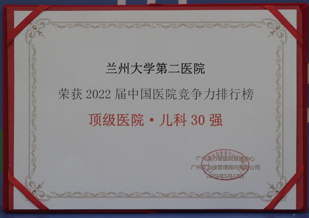 5月11-13日,2023年中国医院竞争力大会在厦门成功召开,会议发布《医院蓝皮书:中国医院竞争力报告(2022)》,公布了“2022届顶级综合医院专科30强排行榜”。其中,兰大二院入选“儿科30强榜单”,是甘肃省唯一上榜医院,实现了甘肃省专科排行榜“零”的突破。