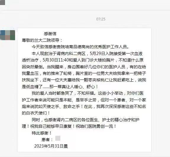 “我的爱人当时都急哭了,不知所措,这些个小小举动,对于你们医护工作者来说可能只是本能、是举手之劳,但对于一个患者,对一个家庭来说犹如天使之手、救命之手!在此,我深深感谢白衣天使们!”5月31日,回想起那惊险的一瞬间,患者内心充满了感激,更感受到了深深地暖意,他用最真挚的情感为医护人员书写了感谢信。