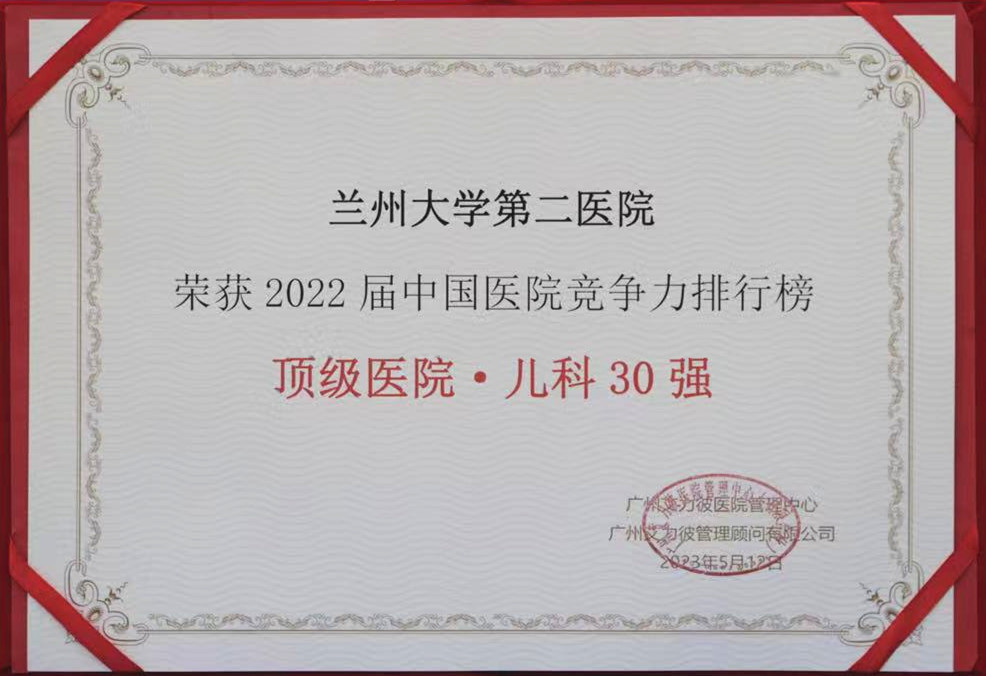 据悉,5月11-13日,在中国医院竞争力大会上发布了《医院蓝皮书:中国医院竞争力报告(2022)》,公布了“2022届顶级综合医院专科30强排行榜”,其中兰大二院儿科入选“儿科30强榜单”,是甘肃省唯一上榜医院,实现了甘肃省专科排行榜“零”的突破。兰大二院儿科(甘肃省儿童医院)始建于1995年,是甘肃省内唯一的集医疗、教学、科研和预防保健为一体的综合性儿童专科,科室设有16个临床、医技科室,可满足患者的就诊需求,科室始终坚持以病人为中心,全心全意为患儿服务,始终坚持公立医院的公益性,积极承担着甘肃省内乃至西北地区的儿童医疗救治、保健和突发公共卫生应急工作任务。