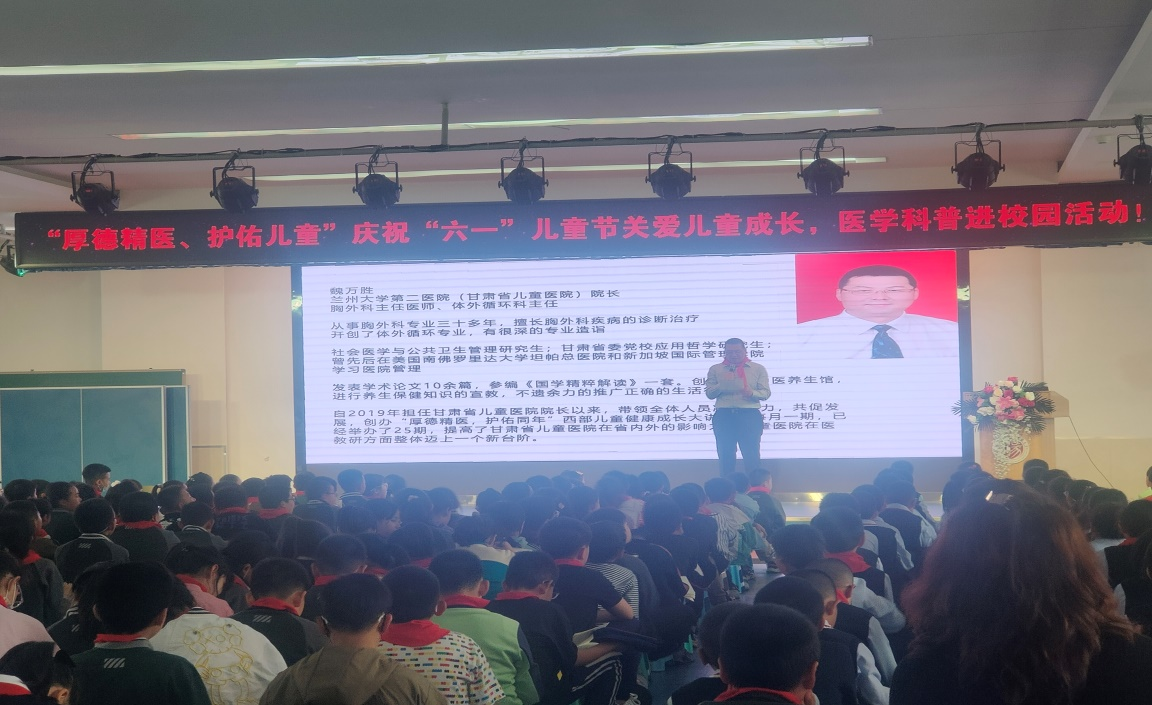 在第73个国际儿童节到来之际,由兰大二院甘肃省儿童医院主办的“厚德精医、护佑儿童”西部儿童健康成长大讲堂在畅家巷小学举办。甘肃省儿童医院院长魏万胜、畅家巷小学校长甘雨阳出席活动。儿童医院医护人员及师生代表300余人参加活动。