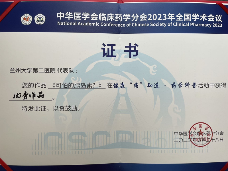 5月28日,由中华医学会临床药学分会主办,四川省医学会、四川省医学科学院、四川省人民医院承办的2023年全国健康“药”知道第三届药学科普大赛在成都举办。兰大二院药剂科武雪、马晶晶、张建花、姜娟组队参赛以“可怕的胰岛素”为题进行了科普情景剧的表演,获全国优秀奖。