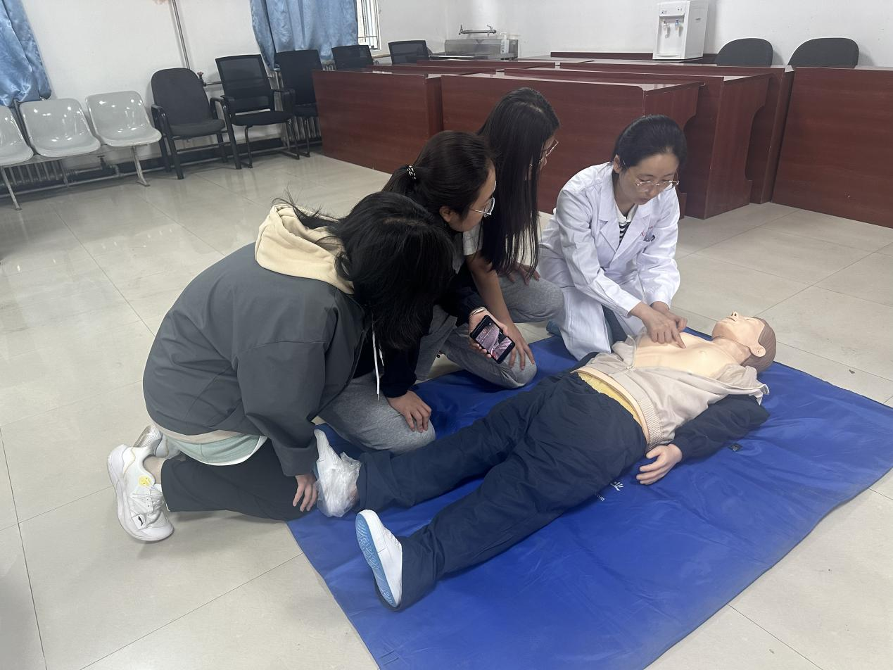 校医院第五批帮扶队队员甄玲玲在现场详细讲解了急救知识和操作步骤,临时党支部的7位党员“手把手”对参训学生进行了指导。通过理论讲解、现场演示与实践操作相结合的方式对心肺复苏及海姆立克急救等急救内容进行培训。同学们认真聆听,仔细观摩,互为搭档、相互学习、及时请教,力求每个操作步骤精准规范。