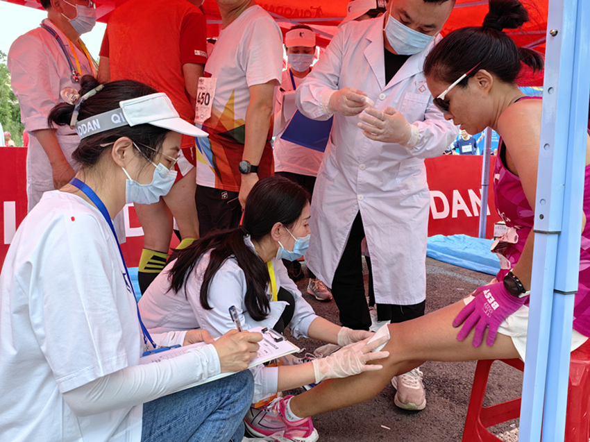 6月11日凌晨5点,志愿者们分设22组,间隔100米设立志愿者服务站点,整装待命,无缝隙、点对点为运动员们保驾护航。整个赛程,兰大二院医疗志愿团队共救助运动员130余名。在完赛区,志愿者帮助20余名选手处理拉伤、体力不支等不适情况。