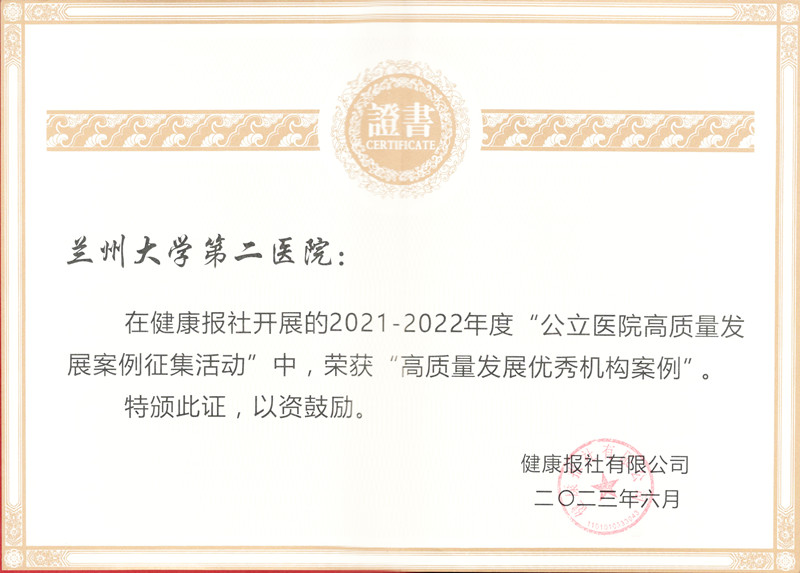 6月17日,由健康报社主办的公立医院高质量发展推进暨国家区域医疗中心建设大会在山西太原市顺利举行。大会对2021年至2022年全国公立医院高质量发展典型案例的获奖机构及个人进行表彰。兰大二院荣获“2021-2022年度公立医院高质量发展优秀单位”荣誉称号,是甘肃省唯一一家上榜医院。