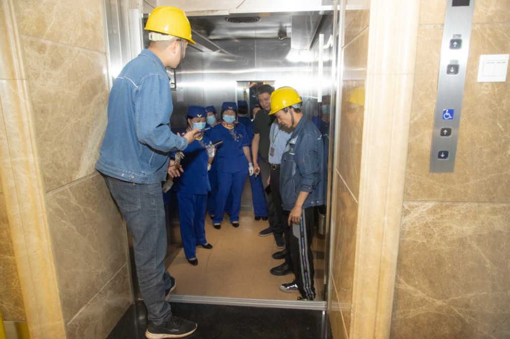 在直梯困人故障演练中,模拟运行电梯因突发停电导致电梯故障,6名乘客被困在轿厢中的场景,电梯司乘在安抚被困人员的同时迅速开展呼救,电梯安全管理员及维保人员接到通知立即赶赴现场,启动电梯困人救援应急预案,在经过十分钟的救援后,梯轿厢内的被困乘客全部安全脱困。随后,维保人员展开电梯故障原因排查,在排除故障试运行正常后交付使用。