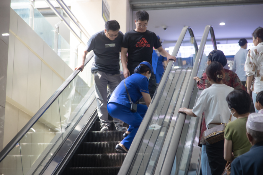在扶梯故障救援演练中,模拟乘客在乘坐扶梯下行的过程中突发意外导致鞋子卡入扶梯梯级,值守的电梯司乘发现后迅速按下急停按钮并协助乘客脱下鞋子安全离开扶梯,电梯管理员及维保人员对扶梯进行检查,解除扶梯故障后正常运行。