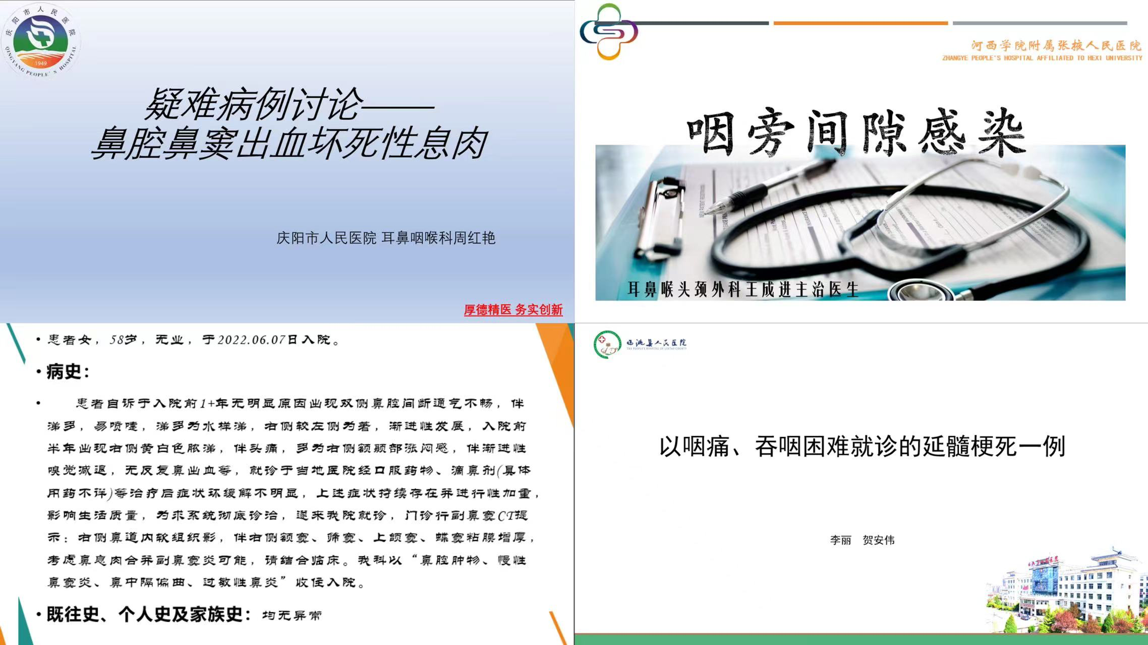 随后,临洮县人民医院、武威市人民医院、庆阳市人民医院、河西学院附属张掖人民医院分别以《咽痛、吞咽困难就诊的延髓梗死一例》《一例鼻腔肿物诊治过程》《鼻腔鼻窦出血性病变的诊治报告》《咽旁间隙感染病例诊治与思考》为题进行病例汇报。兰大二院耳鼻咽喉科徐百成、段世宏,神经外科李强,神经内科蔡宏斌,血液科胡婉丽,口腔科夏鑫等多位专家结合病例实际,从多学科、多元化视角出发,围绕患者病史、诊疗过程、检查结果、病情变化等方面进行分析讨论,形成全面、科学的治疗方案,为后续治疗提出指导性意见。