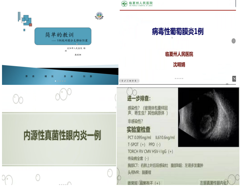 活动中,专家们分别围绕庆阳市人民医院和临夏州医院的《简单的教训—视网膜静脉阻塞1例》《1例特殊的葡萄膜炎》2例病例及由县级医院上转至兰大二院的《真菌性眼内炎1例》《真性小眼球1例》2例疑难病例,从病理生理、发病机制及临床治疗决策等方面进行详细分析、点评,并提出可行性治疗方案。