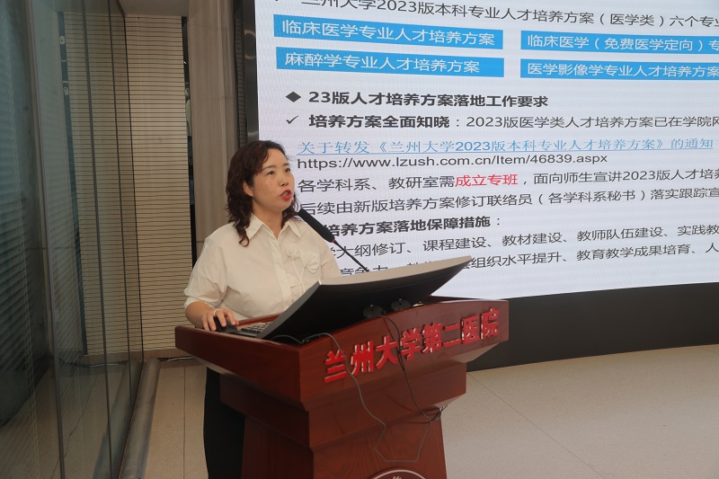 研究生处副处长吴嫚汇报了上半年教学工作情况、新学期工作安排;通报了2023年春季学期各教研室听评课和集体备课完成情况,实习教学工作整改情况、“萃英杯”青年医师讲课比赛、临床技能教学培训、一流本科课程申报、实习基地建设等重点工作推进完成情况。