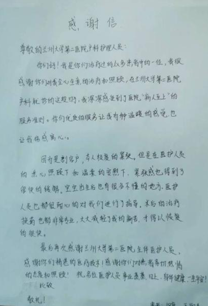 这是一封来自产科王女士的感谢信,信中提到,她非常感谢医护人员对她全心全意的治疗和照顾,在住院期间,王女士深感“病人至上”的服务准则。尤其是在做完剖宫产手术后,医护人员的悉心照顾和安慰,使她紧张、恐慌的情绪很快得到缓解。她对产科全体医护人员精湛的医疗技术和亲切热情的服务态度表示了肯定与感恩。