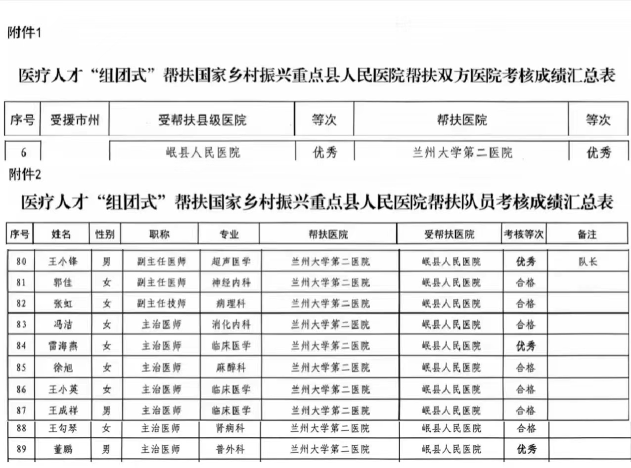 2023 年6月下旬,甘肃省委组织部、甘肃省卫健委牵头,集中对 2022 年度医疗人才“组团式”帮扶工作进行现场考核,经综合评定,帮扶双方医院 (或医院团队)各有7个被评为“优秀”,16 个被评为“良好”,159名帮扶队员 (含帮扶队长),48 名被评为“优秀”,111名被评为“合格”。其中,兰大二院和岷县人民医院(兰大二院帮扶医院)在此次考核中喜获“优秀”,兰大二院“组团式”帮扶队队长、岷县人民医院院长王小锋,队员雷海燕、董鹏被评为“优秀个人”,其余7人被评为合格。