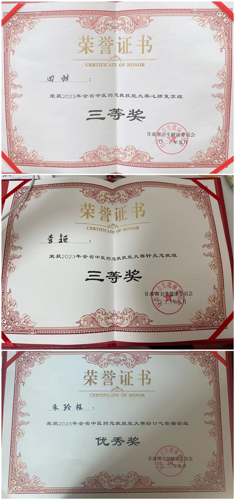 9月7日—9日,由甘肃省卫健委主办,甘肃省中医院、甘肃省中医药学会承办的2023年甘肃省中医药急救技能大赛顺利举办。兰大二院中医科田甜荣获心肺复苏个人三等奖、李颖荣获针刺定位操作个人三等奖、朱玲桂荣获气管插管个人优秀奖。