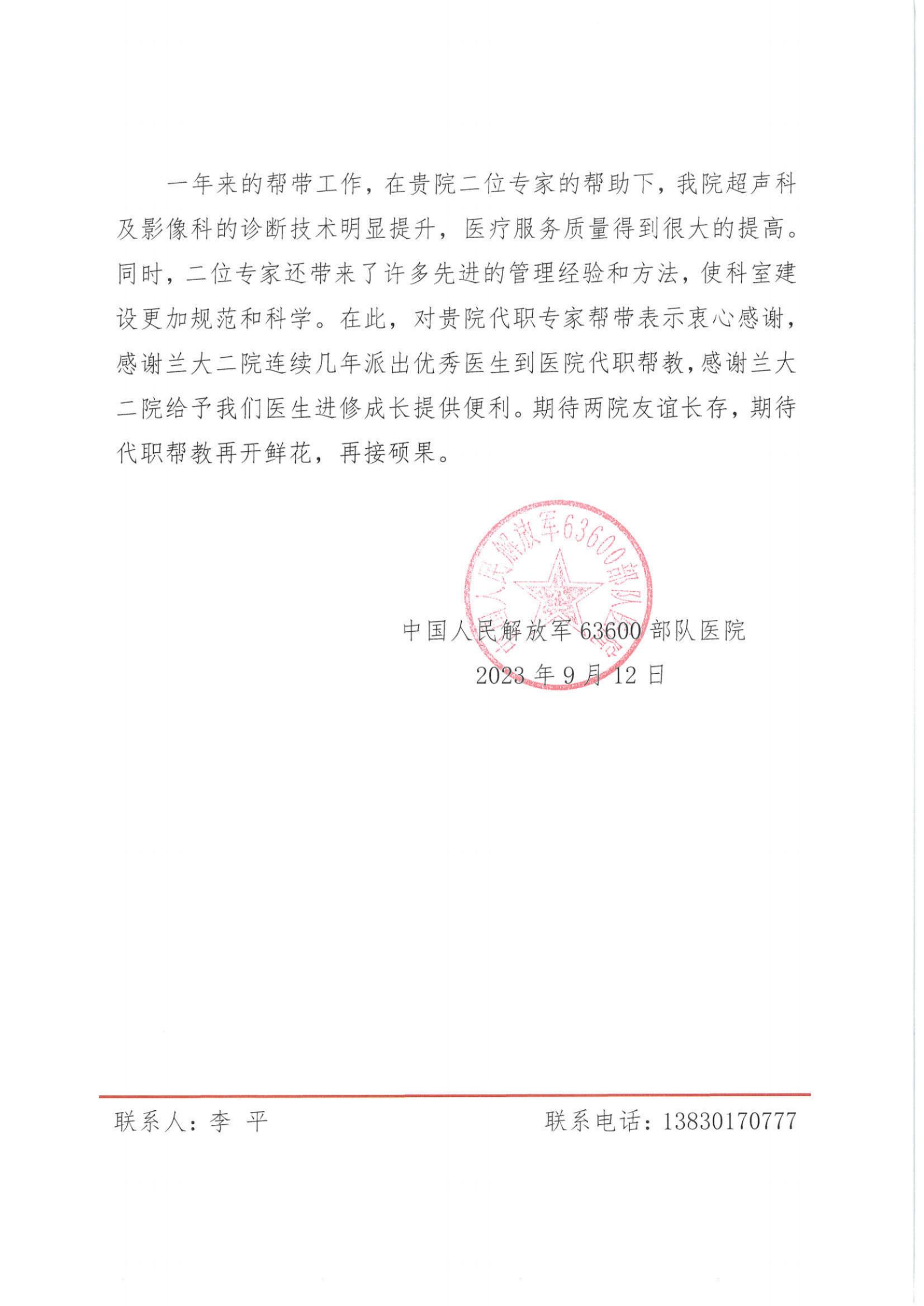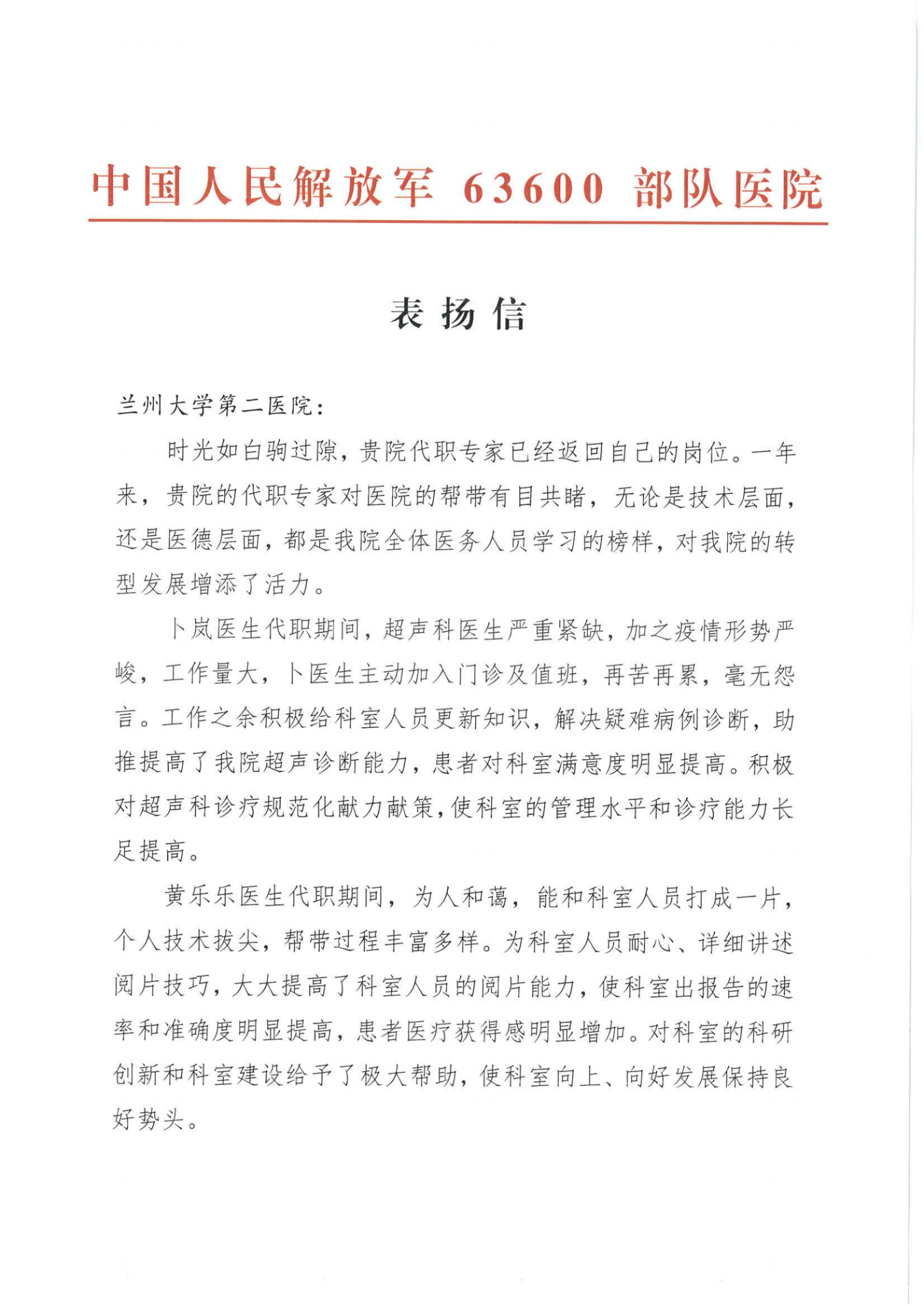 近日,兰大二院收到了一封来自中国人民解放军63600部队医院的表扬信,信中对兰大二院2022年派出的对口帮扶队员,超声医学中心卜岚、核医学科黄乐乐两名医师的支援帮扶工作给予充分肯定和高度赞扬,对兰大二院的帮扶工作给予了衷心感谢。两位队员在支援期间,在医德医风、医疗技术、医疗质量及诊疗能力方面表现优秀,成为了63600部队医院医务人员学习的榜样。