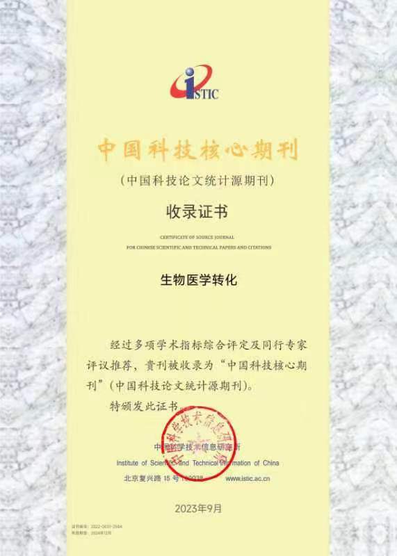入选中国科技核心期刊,标志着《生物医学转化》的学术质量与影响力均获得了高度认可。今后,编辑部将以此为契机,化荣誉为动力,进一步深化办刊能力和水平,争办一流期刊,为推动我国科技期刊发展贡献力量!