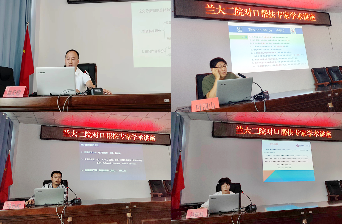 讲座上,兰大二院帮扶专家刘光耀、叶凯山、马如超、陈培章、赵雅莉围绕《医学论文写作概述》《论文写作格式与规范》《论文文献检索及管理》《护理论文的选题》主题,从文献检索、论文选题、论文写作规范与格式、科研诚信、医学伦理等方面进行详细讲解。同时,对论文评审工作中发现的常见问题进行了剖析,为今后基层医院如何进一步提高医务人员的医、教、研能力提出了指导意见。