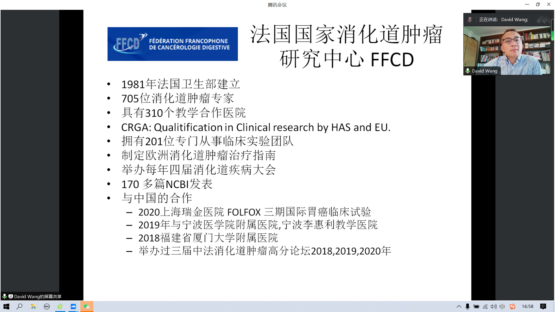 交流会上,双方就各自团队开展的临床工作及科研工作进行了介绍,David Wang重点介绍了拟进行交流合作的法国奥尔良大学附属医院、巴黎居里夫人医院及法国国家消化道肿瘤研究中心(FCCD)的情况。经过2个多小时的讨论、交流,双方在临床诊疗、临床试验团队培训建设、临床药物研发、人才联合培养、远程专家会诊等多方面达成了初步共识。